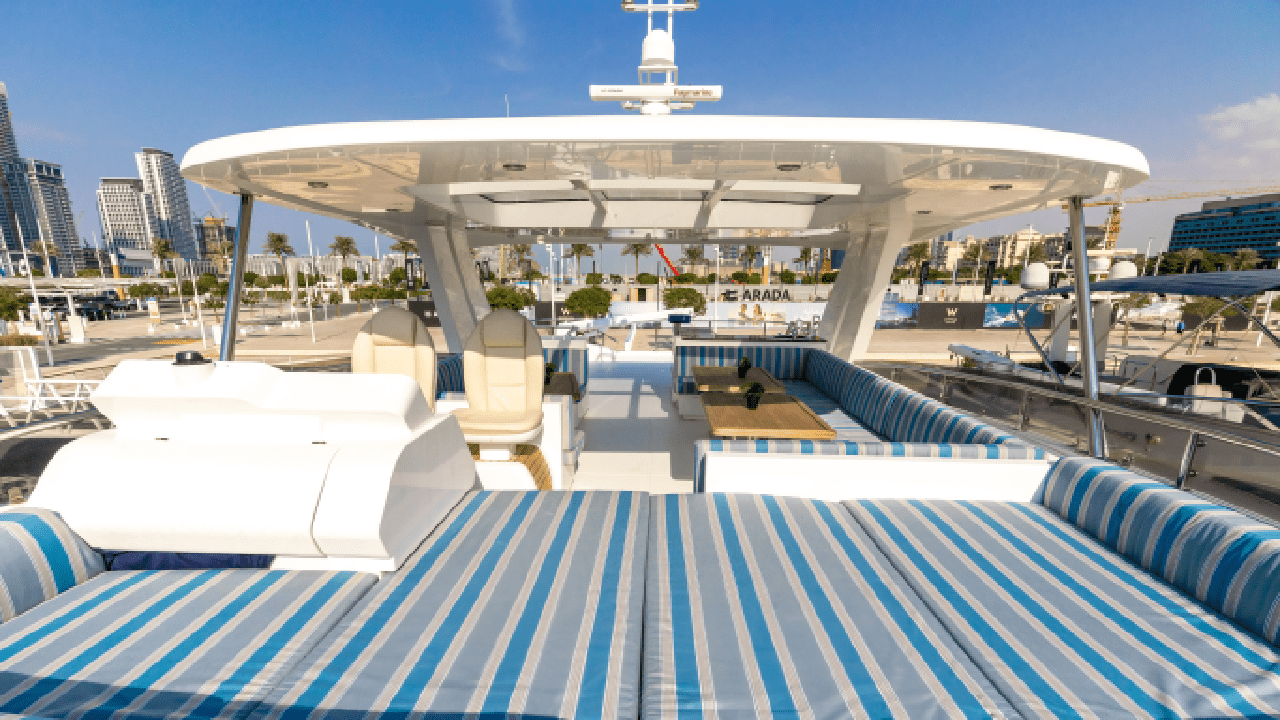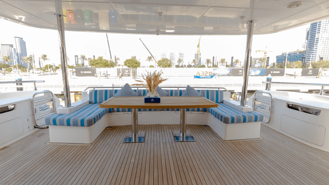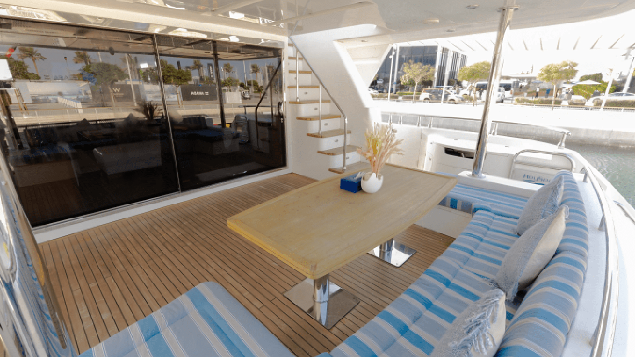 - Large aft outdoor seating lounge with cushioned sofas